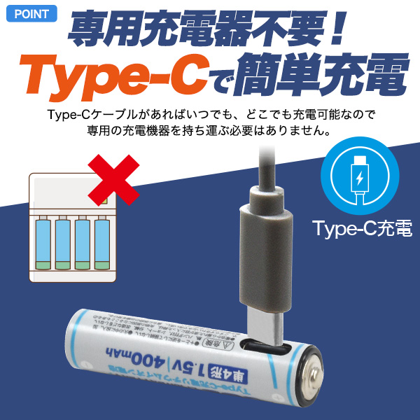 画期的!Type-Cケーブルでダイレクトに充電! Type-C充電リチウムイオン電池(単4形×4本セット)