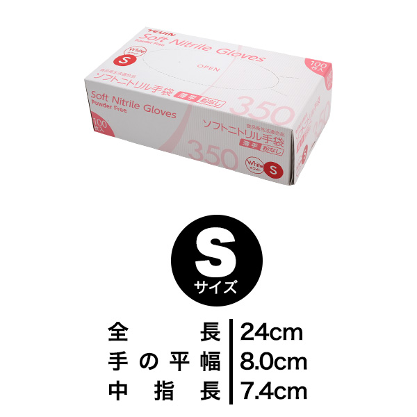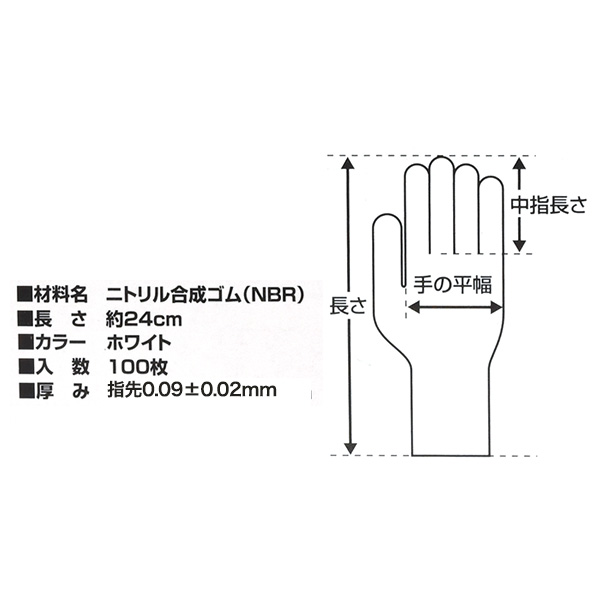 サイズ | サイズ(約) 全長:24cm 手の平幅:8.0cm 中指長:7.4cm 厚み(約) 指先:0.09±0.02mm 入数 100枚入 規格 食品衛生法適合 カラー ホワイト メーカー品番 SNBR-PF350W-S |