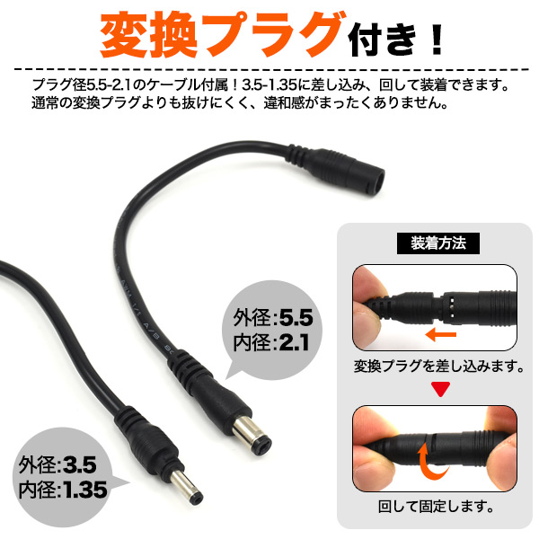 プラグ径5.5-2.1のケーブル付属!3.5-1.35に差し込み、回して装着できます。