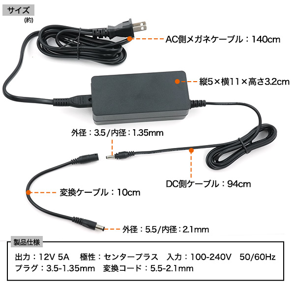 | サイズ | 出力 12V 5A 極性 センタープラス 入力 100-240V 50/60Hz 重さ 300g プラグ径 3.5-1.35mm 変換ケーブル:5.5-2.1mm |