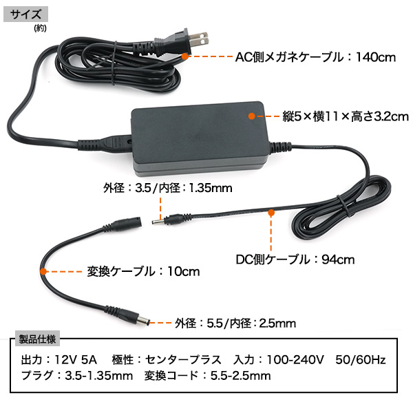 サイズ | 出力 12V 5A 極性 センタープラス 入力 100-240V 50/60Hz 重さ 300g プラグ径 3.5-1.35mm 変換ケーブル:5.5-2.5mm |