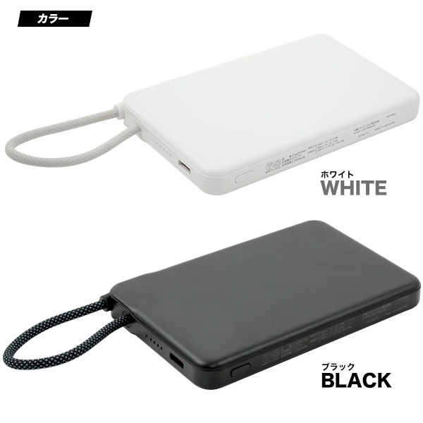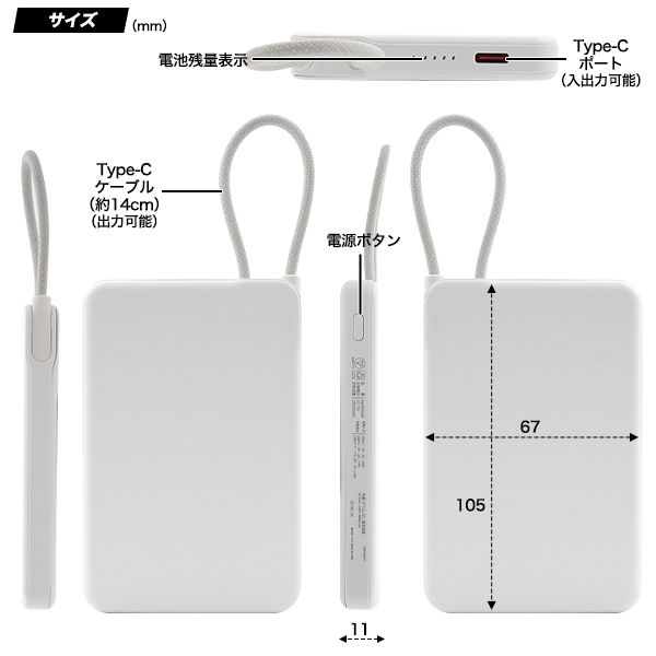 | サイズ | 製品仕様 サイズ(約) 縦105×横67×厚み11mm 重量(約) 115g 容量 (内蔵リチウムイオン容量) 5000mAh 定格容量 2800mAh 定格電圧 DC5V 入力 USB Type-C: 5V2A 出力 USB Type-C:5V2A USB Type-Cケーブル:5V2A 収納ケーブル USB Type-CtoCケーブル(出力のみ) コネクタ形状 USB Type-C(入出力) 適正保存温度 0~35℃ 動作温度 -10~60℃ |