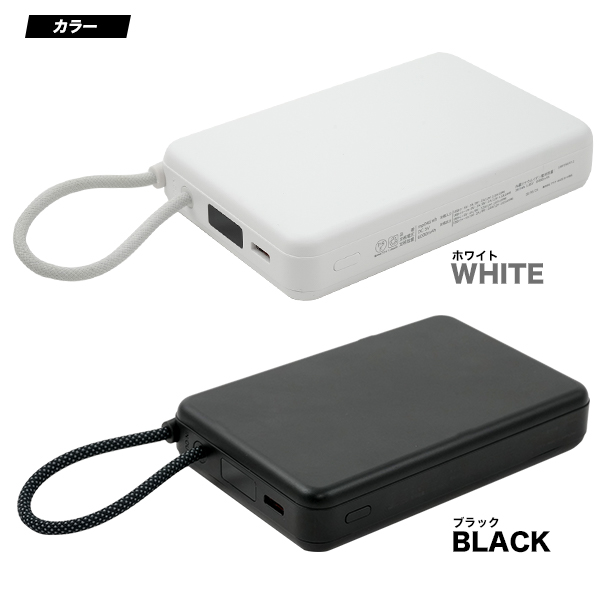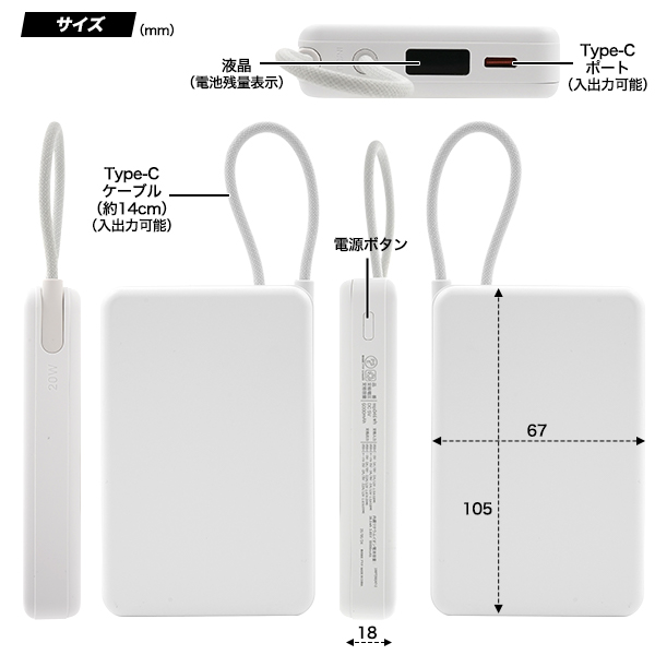 本体には、バッテリーの充電と他機器への給電の両方に使えるType-Cケーブルが一体化されています。 そのため、充電用ケーブルを別途持ち運ぶ必要がなく、荷物がかさばりません。 ケーブルを忘れたり紛失する心配もなく、ポケットに収まるサイズで携帯にも便利です。