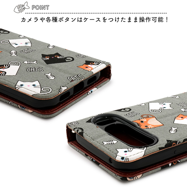 食いしん坊な猫ちゃん達を全面にプリントした生地を使用した手帳型ケースです。