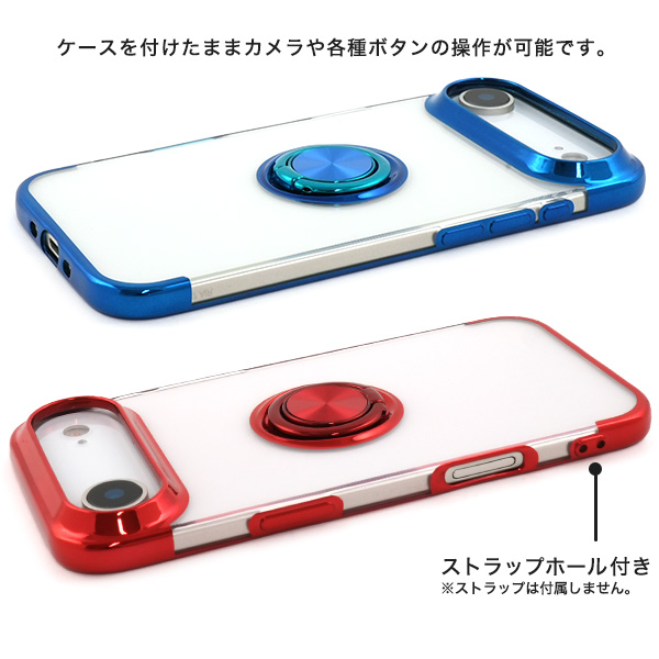 落下防止用のスマホリングが付いた、メタルカラーバンパーソフトクリアケースです。