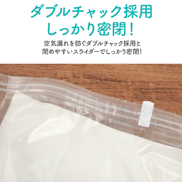 空気漏れを防ぐダブルチャックと、閉めやすいスライダー付きでしっかり密閉。