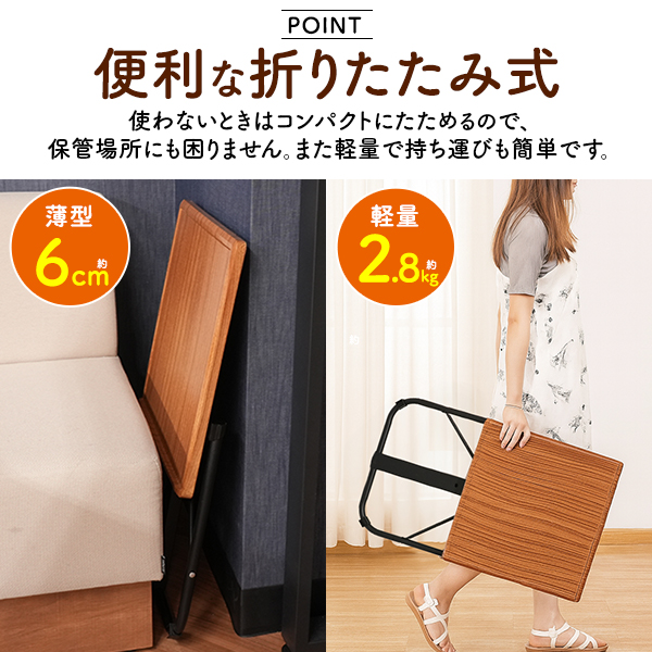| サイズ | サイズ(約) テーブル:縦45×横45cm 高さ:72/65/58cm 脚::縦45×横43cm 収納時::縦61×横42×厚み6cm 重量(約) 2.8kg 高さ調節 3段階 72/65/58cm 角度調節 3段階 |