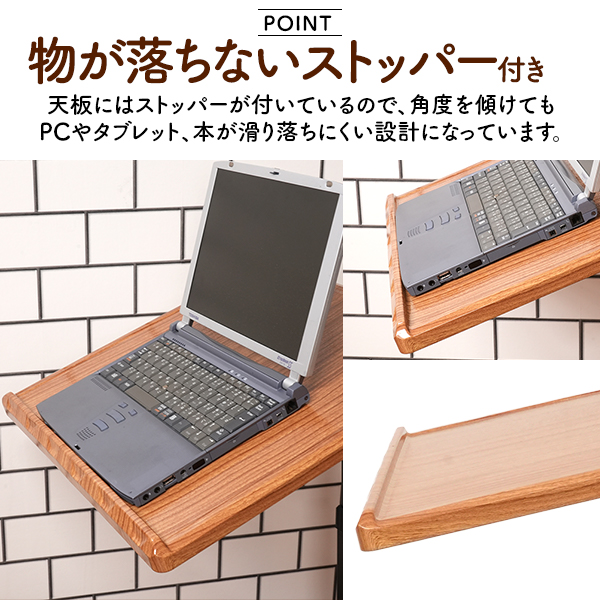 天板にはストッパーが付いているので、角度を傾けてもPCやタブレット、本が滑り落ちにくい設計になっています。