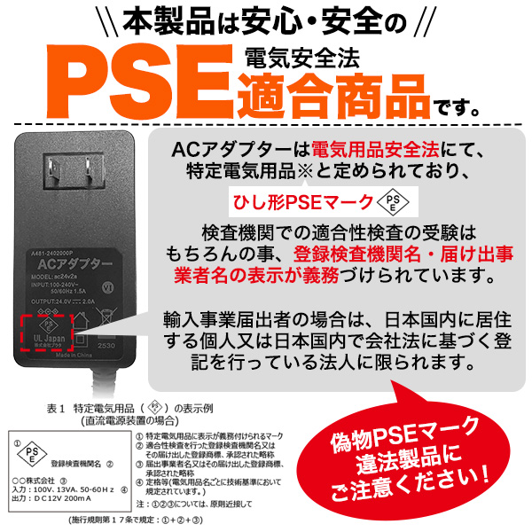 ACアダプターは電気用品安全法にて、 特定電気用品(ひし形PSEマーク)と定められており、