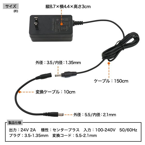 | サイズ | 出力 24V 2A 極性 センタープラス 入力 100-240V 50/60Hz 重さ 167g プラグ径 3.5-1.35mm 変換ケーブル:5.5-2.1mm |