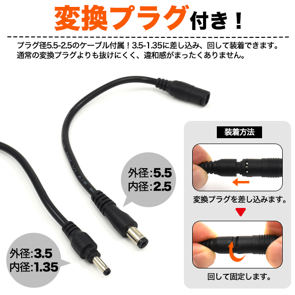 プラグ径5.5-2.5のケーブル付属!3.5-1.35に差し込み、回して装着できます。