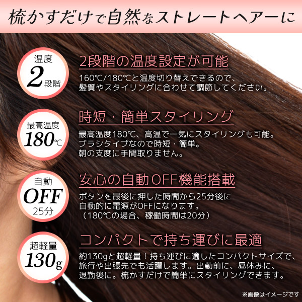 ブラシ型アイロンなので髪を梳かすだけでセット完了、忙しい朝にも時短・簡単。