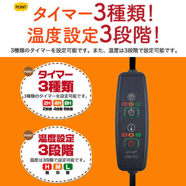 3種類のタイマーを設定可能です。温度は3段階で設定可能です。