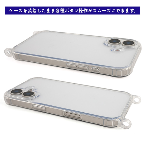 お好みのストラップと合わせて使えるリング型のストラップホールが付いたクリアケースです。