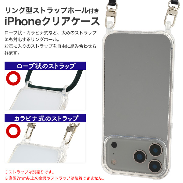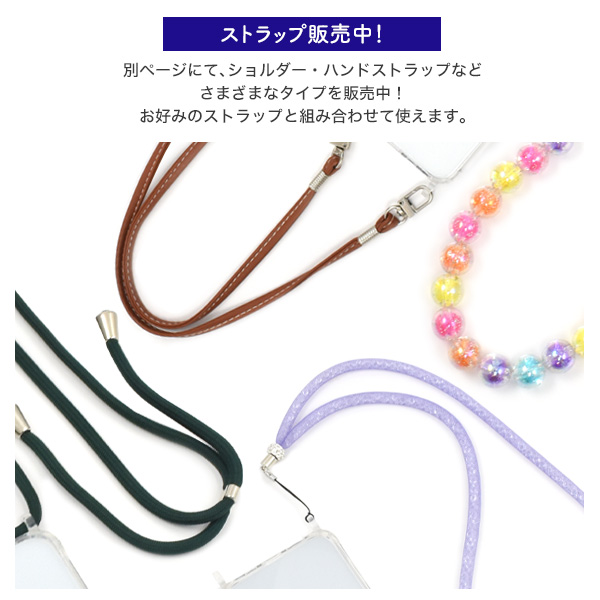 お好みのストラップと合わせて使えるリング型のストラップホールが付いたクリアケースです。