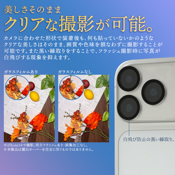 カメラに合わせた形状で装着後も、なにも貼っていないかのようなクリアな美しさはそのまま、画質や色味を損なわずに撮影することが可能です。