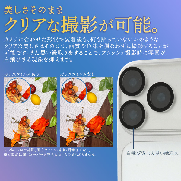カメラに合わせた形状で装着後も、なにも貼っていないかのようなクリアな美しさはそのまま、画質や色味を損なわずに撮影することが可能です。