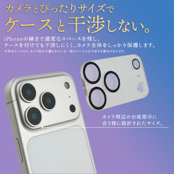 カメラ周辺の四角い台座部分に合うように設計されたサイズでiPhoneの縁まで適度なスペースを残し、ケースを付けても干渉しにくく、カメラ全体をしっかり保護します。