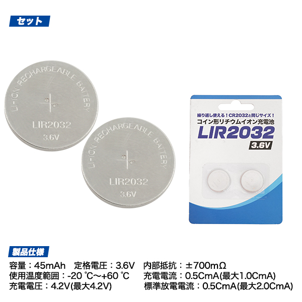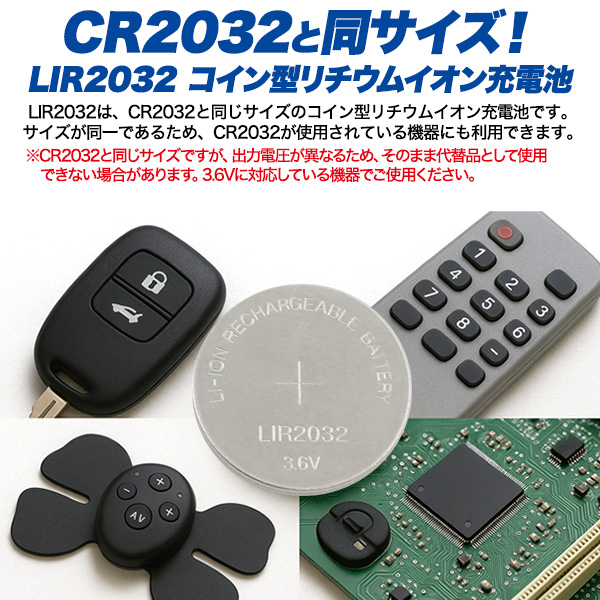 CR2032と同サイズのLIR2032 LIR2032 コイン型リチウムイオン充電池