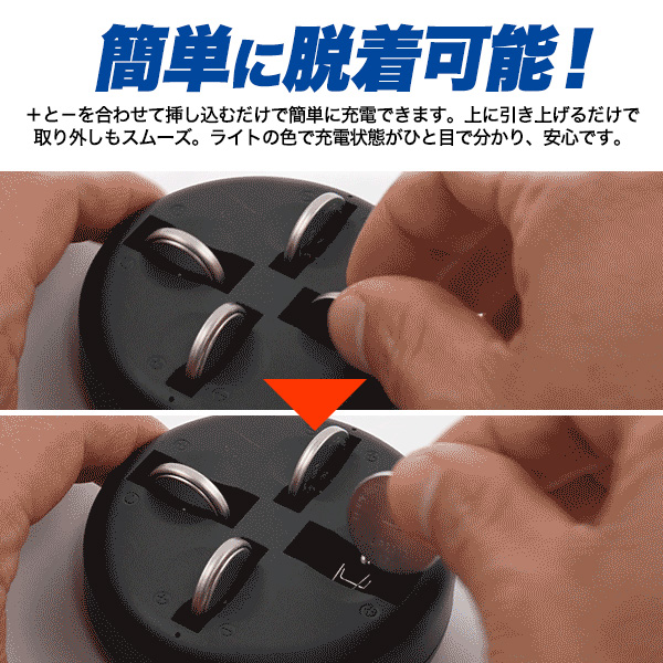 +と-の向きを合わせて挿し込むだけで、簡単に充電できます。 取り外す際は、上方向に軽く引き上げるだけでスムーズに外せます。 また、充電状態はライトの色でひと目で確認できるため、安心してお使いいただけます。