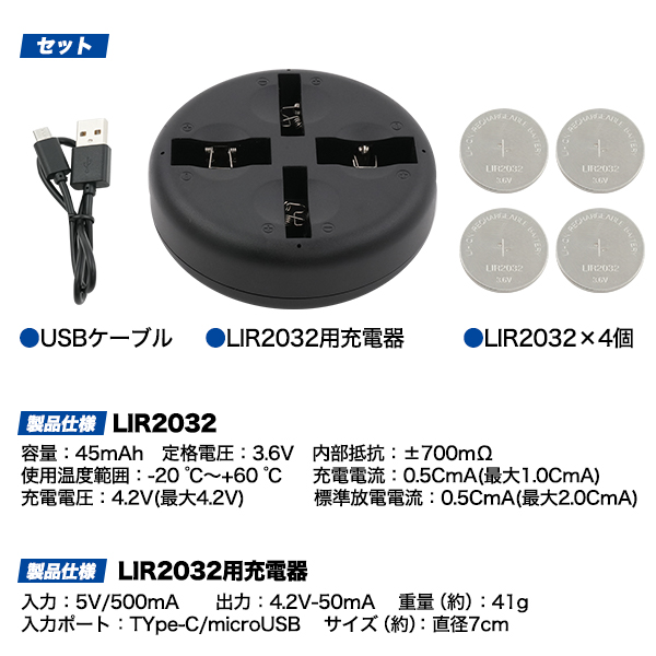 | サイズ | 【IR2032 製品仕様】 容量 45mAh 定格電圧 3.6V 内部抵抗 ±700mΩ 使用温度範囲 -20℃~+60℃ 充電電流 0.5CmA(最大1.0CmA) 充電電圧 4.2V(最大4.2V) 標準放電電流 0.5CmA(最大2.0CmA) 【LIR2032用充電器 製品仕様】 入力 5V 500mA 出力 4.2V 50mA 入力ポート microUSB /Type-C サイズ(約) 直径7cm 重量(約) 41g |