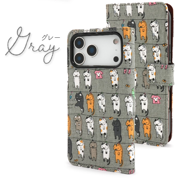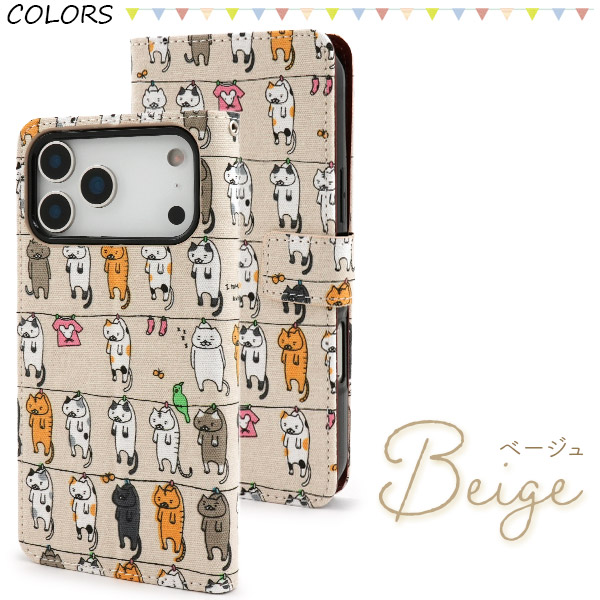 猫好きなら気に入ること間違いなし!!いっぱいの猫達が干されている柄の手帳型ケースです。