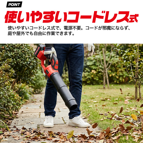 使いやすいコードレス式で、電源不要。コードが邪魔にならず、 庭や屋外でも自由に作業できます。