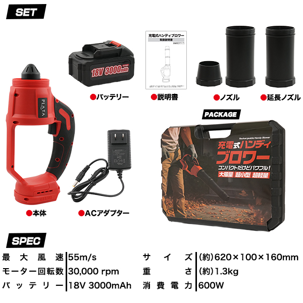| サイズ | サイズ(約) 620×100×160mm 重量(約) 1.3kg 電源方式 充電式 最大風速 55m/s モーター回転数 30,000 rpm 消費電力 600W バッテリー 18V 3000mAh セット内容 本体・バッテリー・説明書・ACアダプター・ノズル・延長ノズル |