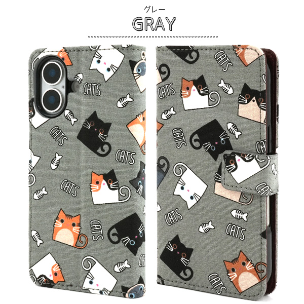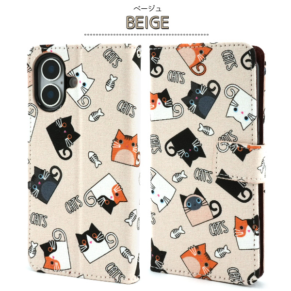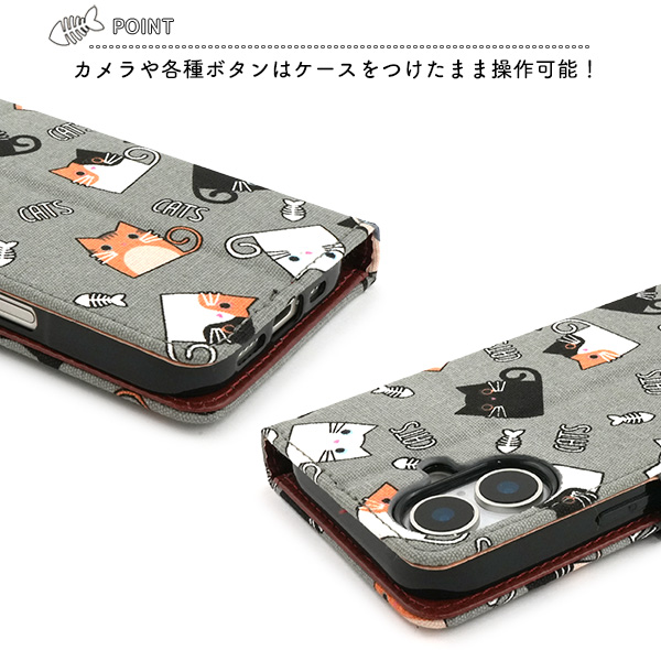 食いしん坊な猫ちゃん達を全面にプリントした生地を使用した手帳型ケースです。