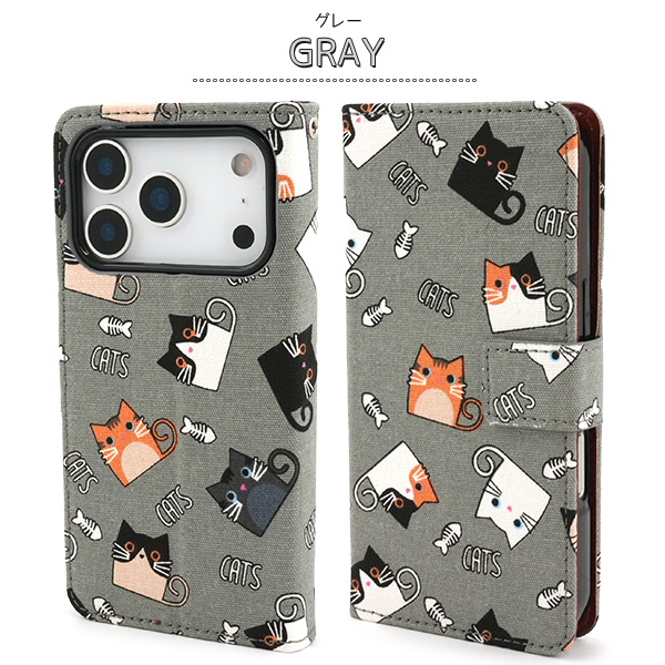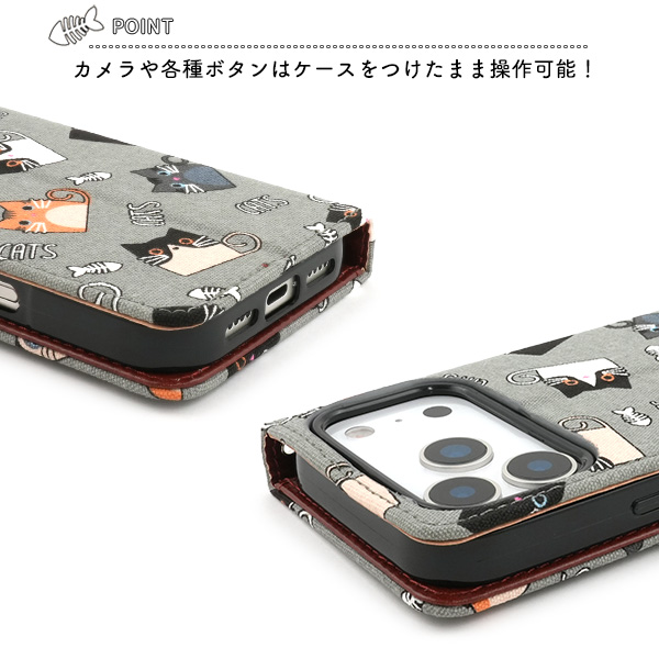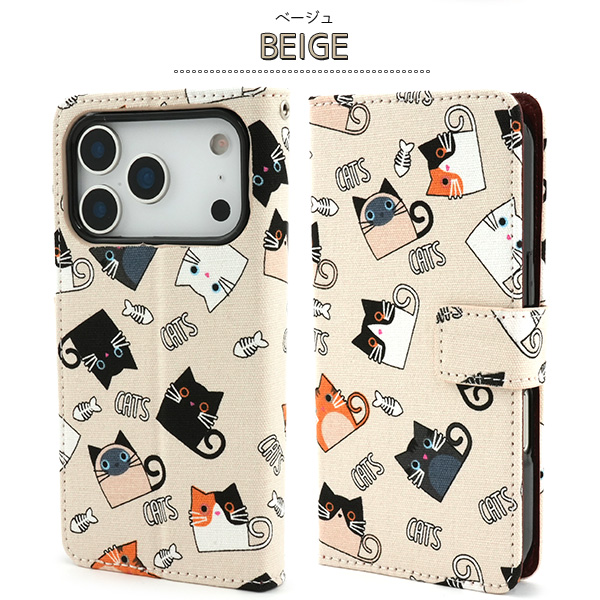 食いしん坊な猫ちゃん達を全面にプリントした生地を使用した手帳型ケースです。