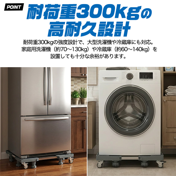 耐荷重300kgの強度設計で、大型洗濯機や冷蔵庫にも対応。家庭用洗濯機( 約70~130kg)や冷蔵庫(約60~140kg)を設置しても十分な余裕があります。