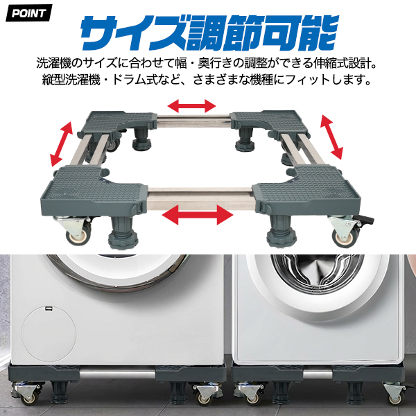 洗濯機のサイズに合わせて幅・奥行きの調整ができる伸縮式設計。