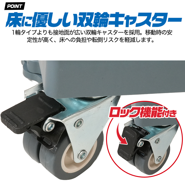 1輪タイプよりも接地面が広い双輪キャスターを採用。移動時の安定性が高く、床への負担や転倒リスクを軽減します。