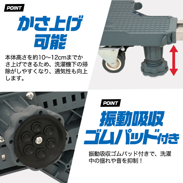 | 注意事項 | ※画像は使用イメージです。実際の商品と異なる場合がございます。 ※メーカーによってはキャスター付きの洗濯機台の使用を禁止されている場合がります。予めご了承ください。 ※耐荷重300kgは均等荷重時の最大値です。 ※設置する床の状態(傾き・強度・材質)や使用環境により、安定性が異なる場合があります。 ※設置後は必ず水平器を確認し、8本ジャッキでしっかり固定してください。 ※キャスターで移動する際は、必ず家電の電源を切り、中身を減らした状態で行ってください。 ※移動後はキャスターのロックをかけ、安定していることを確認してからご使用ください。 ※本商品は家庭用家電向けです。業務用・極端に重量のある機器には使用しないでください。 |