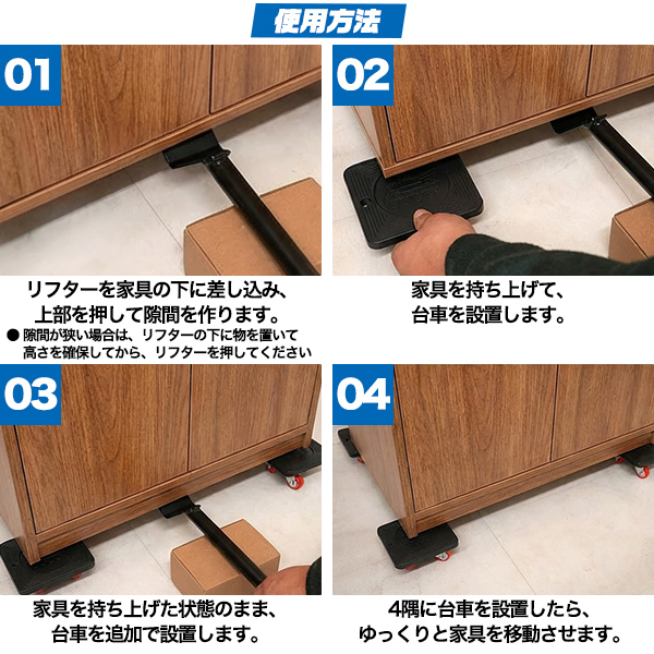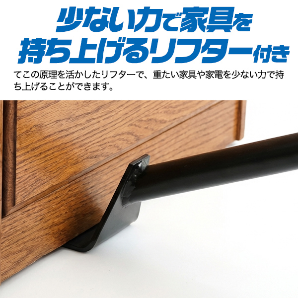 てこの原理を利用し、重たい家具や家電を少ない力で持ち上げられる専用リフター付き。 家具の下に差し込んで押し下げるだけで簡単に持ち上がり、台車をセットすることで安全に移動できます。