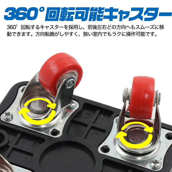 360°回転するキャスターを採用し、前後左右どの方向へもスムーズに移動できます。方向転換がしやすく、狭い室内でもラクに操作可能です。