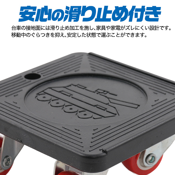 台車の接地面には滑り止め加工を施し、家具や家電がズレにくい設計です。移動中のぐらつきを抑え、安定した状態で運ぶことができます。
