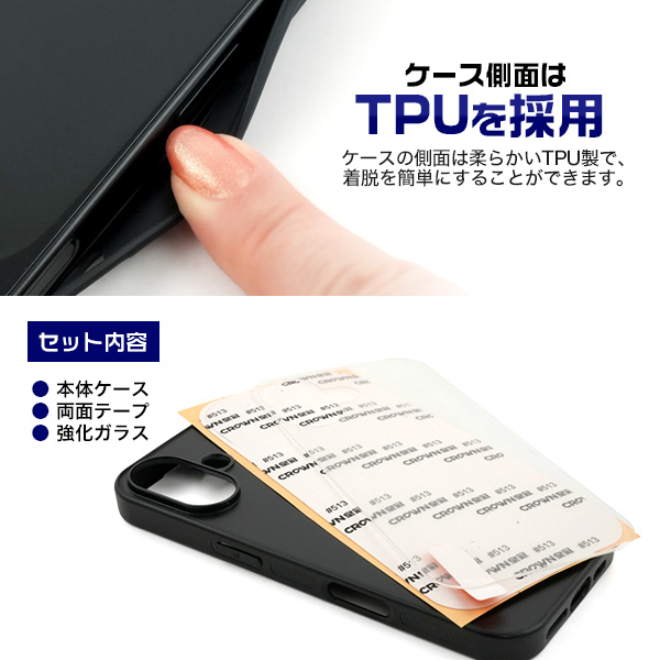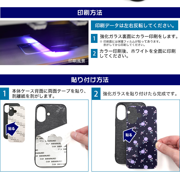 強化ガラスの裏面に反転したデータを印刷し、印刷面をケースに貼り付けるため、摩擦による印刷落ちの心配がなく、素材の光沢感を活かせるケースです。