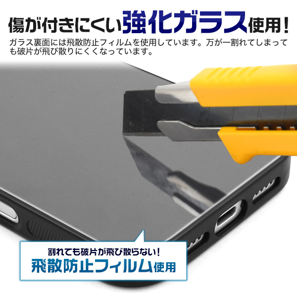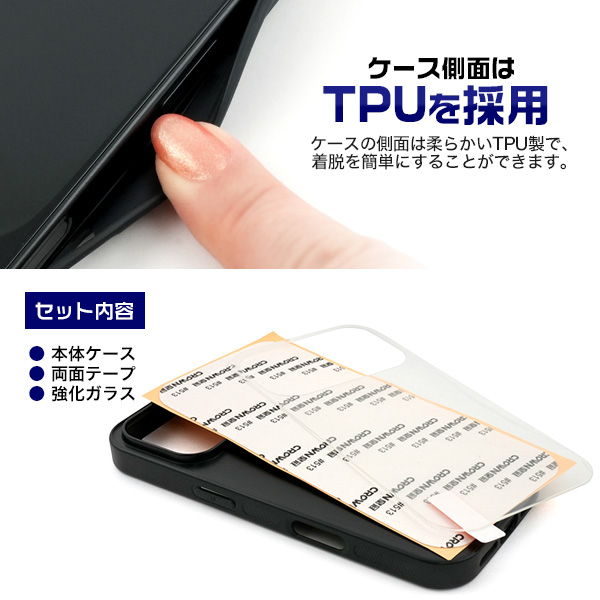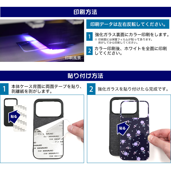 強化ガラスの裏面に反転したデータを印刷し、印刷面をケースに貼り付けるため、摩擦による印刷落ちの心配がなく、素材の光沢感を活かせるケースです。