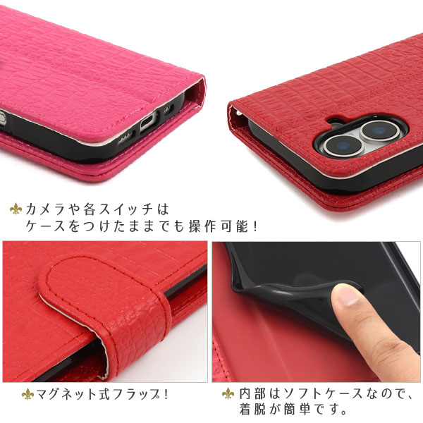 クロコダイルレザーデザインの手帳型ケース。
