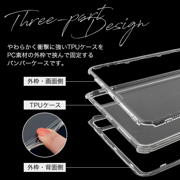やわらかく衝撃に強いTPUケースを、PC素材の外枠で挟んで固定する