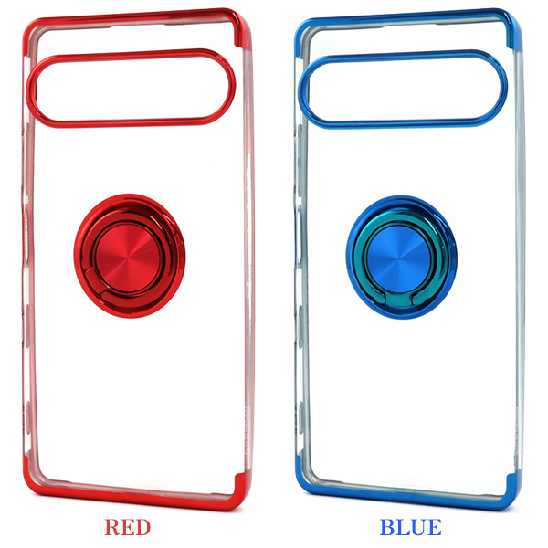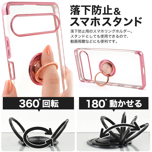 落下防止用のスマホリングが付いた、メタルカラーバンパーソフトクリアケースです。