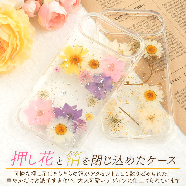 本物のお花と華やかな箔をケースに閉じ込めた、押し花クリアケース。