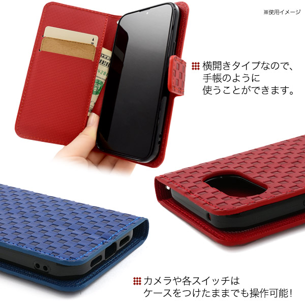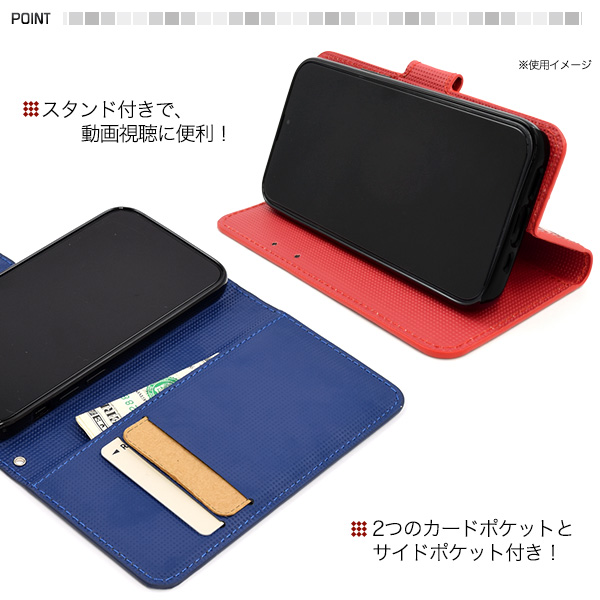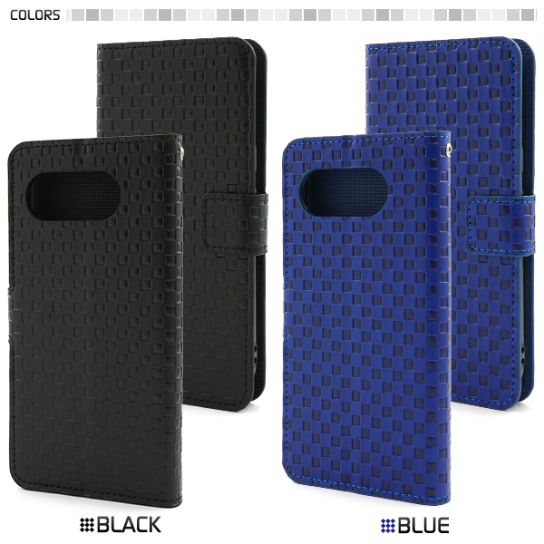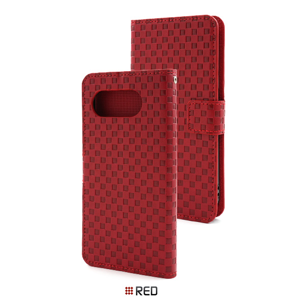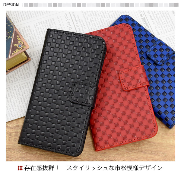 存在感抜群!市松模様レザーデザインの手帳型ケース。 衝撃やキズなどからスマホを守ります。 また、内部はソフトケースなので着脱が簡単です。 背面を折り返すとスタンドとして使用できるので、動画視聴に便利です。 落下防止に便利なストラップとストラップホール付きです。 横開きタイプなので、手帳のように使うことができます。  また、内側に2つのカードポケットとサイドポケットが付いています。